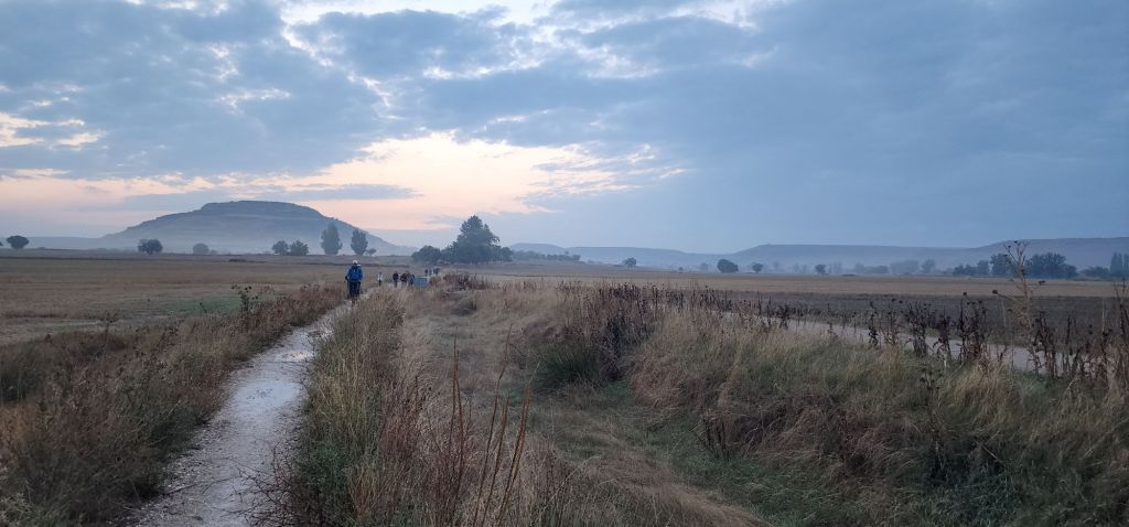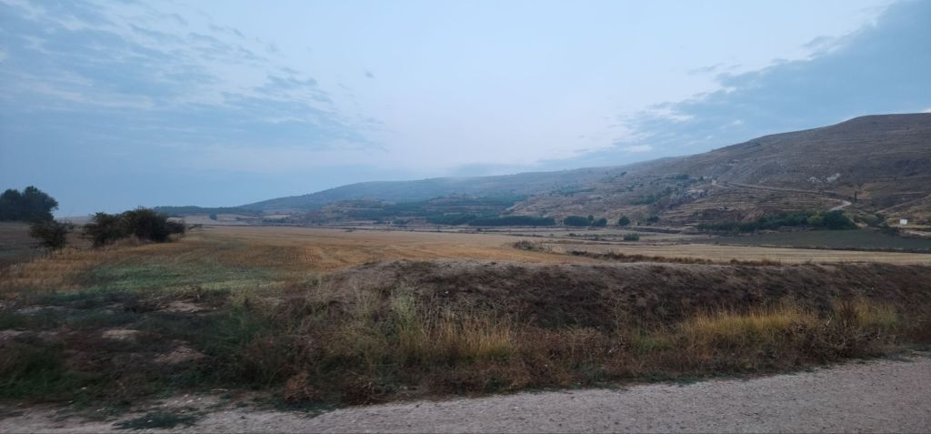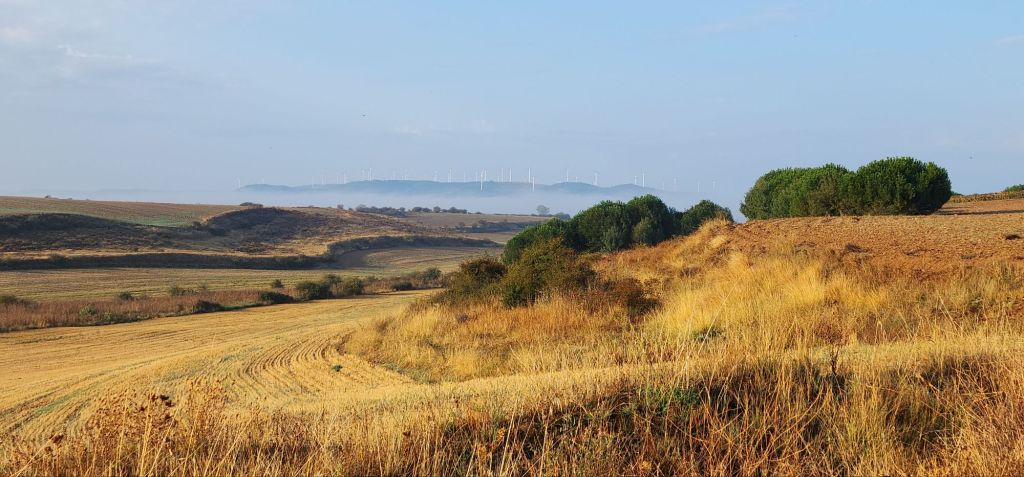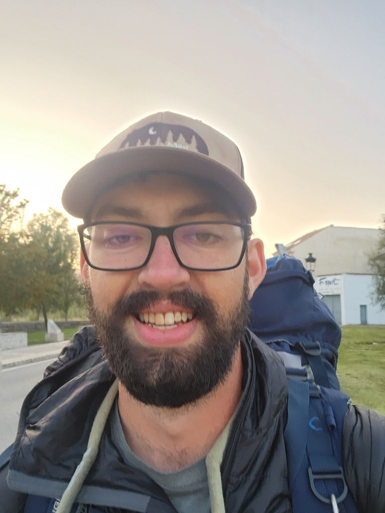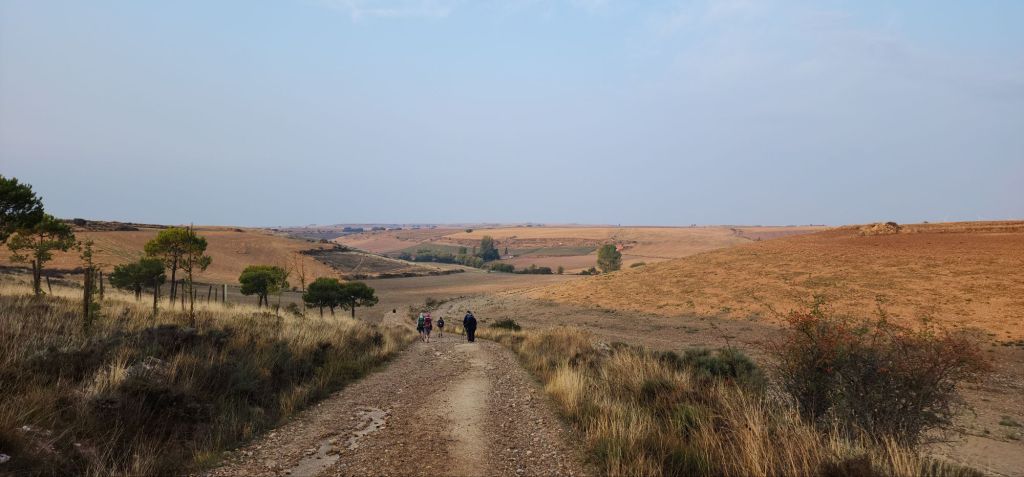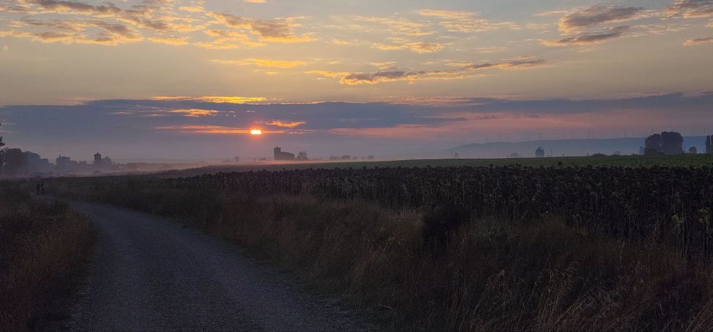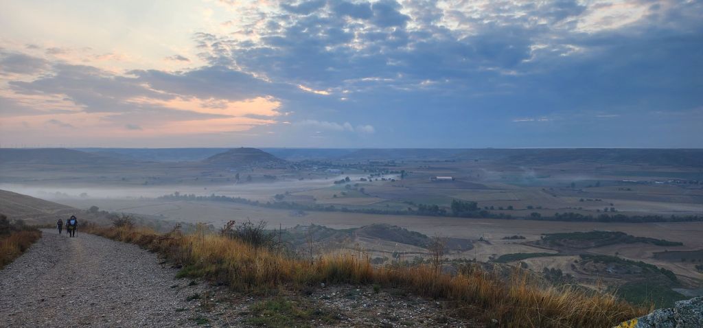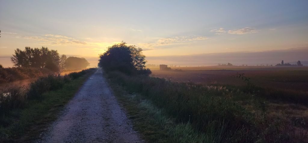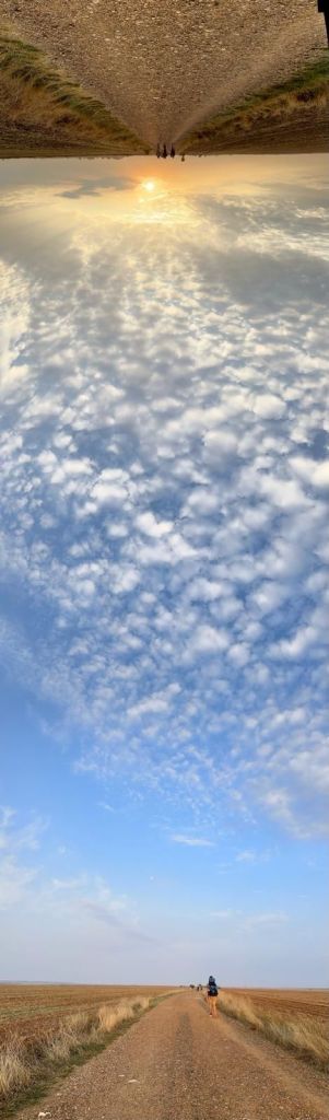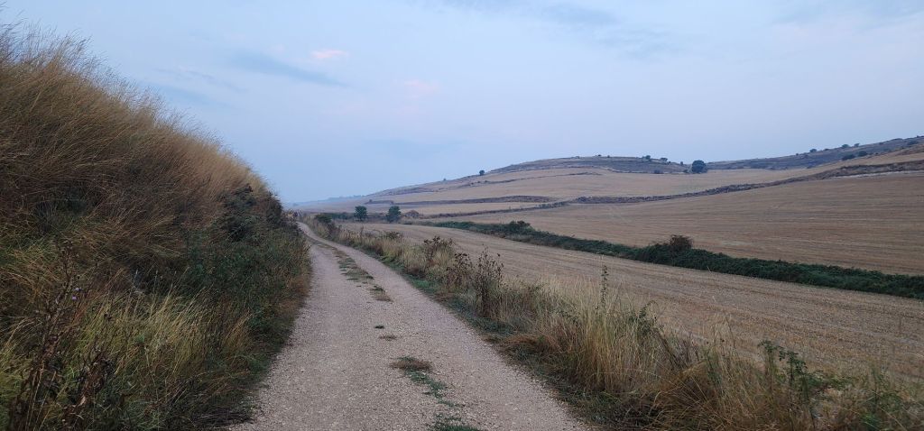 The second day of hiking in the meseta, the scenery was a little bland, but still very beautiful. I met and walked with Joe and Bunny from Florida, a brother sister duo. Joe was retired IT and IT leadership, and Bunny was a medical technician. Joe and I nerded out for a bit, and he passed down some good advice. Stopped for breakfast at an albergue off the path, but ended up running into so many folks I’ve met it was worth it. Breakfast was also very good, omelette with chorizo. A cat was playing with all of the pilgrams and also jumping around the field — very funny to watch. Night before was a symphony of different synchronized snoring, honestly impressive, but terrible to sleep to. The afternoon had too many gnats to deal with — the buff came in pretty handy to block them all out.