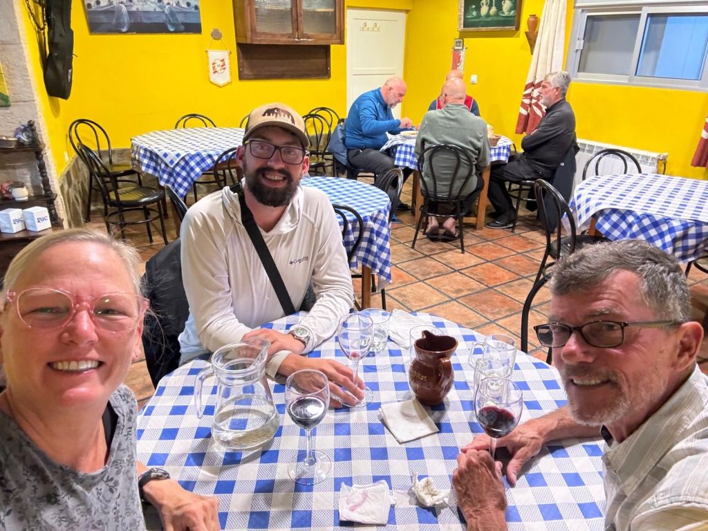 Pretty typical day on the trail on this day — hiking, briefly chatting and meeting new folks, and then chilling at the albergue. A big climb and descent in the morning led to some pretty views, and I was able to chat with Kait from BC for a bit. My albergue this night was called Juntos; known for their vegetables and Dutch pancakes. Absolutely delicious dinner! Ran into friends Wendy, Barbara, Inez, and James. Also made new friends with a group from British Columbia and Alaska — all great folks, and although a slight spoiler, I’ve ran into them several times since! Stephanie and Ray own and manage the northernmost USGA golf course in Alaska, and it is entirely run and maintained by individuals with special needs. Their story was incredible, and its on my list of places to visit! Midnight Sun Golf course. Heather and Greg were the other couple, old farmers, serial entrepreneurs, and overall good folks. Greg is an award winning auctioneer for cattle — and he proved it too. Very cool to hear/see! The dog you see was a greeter at a Italian Monk run albergue, and the cat followed me around talking for a good 30 min while I was on the phone.