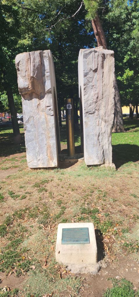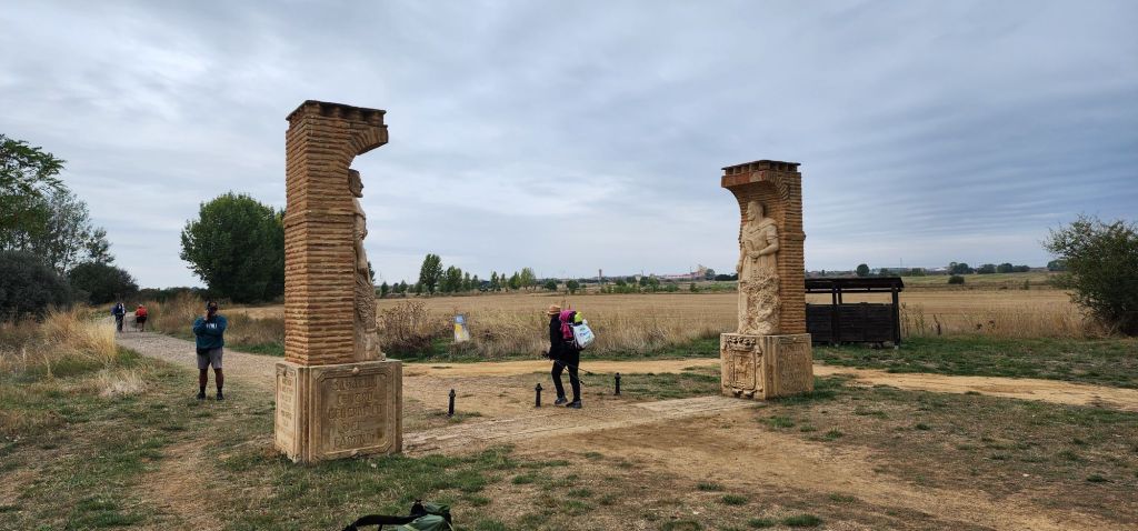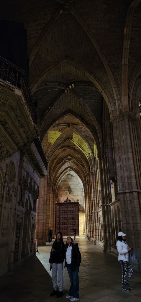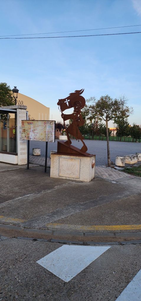 This was a good day for a hike, somewhat overcast, temperature steady and cool, with the sun shining. Passed a cool hobbit hut like structure in the morning, and I ran into camino friends Kevin and Carol from Texas at the coffee shop nextdoor — both absolutely lovely folks who have had a very interesting career, and life in general. They toured and played for the Dave Matthews band, among others. They’ve done extensive travel in south America, and were able to share their stories and also travel the US in a camper van. Might stay in WNC at a point in time. The hike today was the official halfway point to Santiago from the Spanish border (I hit halfway the day before!) and I got a nice halfway certificate, toured the rebuilt/engineered church. They do not make the halls for Collin sized individuals. The big gates are the halfway point marker!